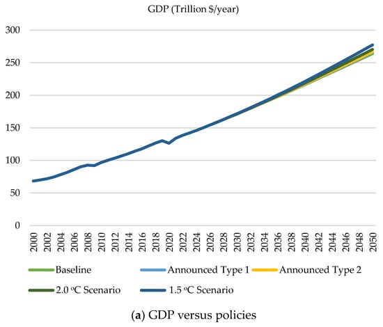 According to the global energy outlook by IRENA in [68], the current investment trajectory needs to be maintained through 2050 with an additional cumulative investment of USD 47 trillion to stay within the 1.5 °C scenario. This sum is in addition to the USD 103 trillion in investments anticipated under the Planned Energy Scenario (herein announced policies type 2 in this study). In this part, both the announced policies type 2 and the 1.5 °C scenario finance requirement were used to estimate the requirements for the other three scenarios, as shown in Figure 4 and with the financial requirements shown in Figure A1 alongside Table A1 and Table A2.