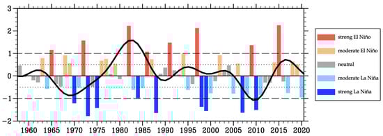 The bars in Figure 1 depict the normalized Niño3.4 index during 1958–2020. In the current work, ENSO episodes are chosen while the absolute value of Niño3.4 index passes 0.5. According to these standards, twenty-one El Niño and twenty La Niña episodes are chosen (Table 1). According to previous studies, strong and moderate ENSO episodes might exert various influences on climate variations [34,41,42,43]. Therefore, these selected ENSO episodes are further classified into four sub-types, namely strong La Niña episodes with a Niño3.4 index <−1.0, strong El Niño episodes with a Niño3.4 index >1.0, moderate La Niña episodes with a Niño3.4 index ≥−1.0 and <−0.5, and moderate El Niño episodes with a Niño3.4 index >0.5 and ≤1.0. Based on this definition, nine strong La Niña episodes, eight strong El Niño episodes, eleven moderate La Niña episodes, and thirteen moderate El Niño episodes are obtained, as shown Figure 1.