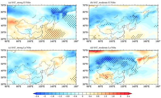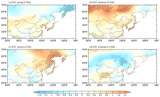 The composite SAT anomalies associated with strong and moderate ENSO episodes are depicted in Figure 2. Obvious positive SAT anomalies are observed over the subtropical northwestern Pacific in strong El Niño winters (Figure 2a), consistent with previous studies [44], while negative SAT anomalies appear in East Asia westward of 120° E related to strong La Niña episodes, with limited significant areas almost invisible (Figure 2c).