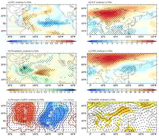 Composite (a) SST, (b) precipitation, (c) divergent wind at 850 hPa (vector) together with velocity potential (contour), (d) SLP, (e) Z500, and (f) 850 hPa wind anomalies during moderate La Niña winters. Anomalies significant at the 95% confidence level are dotted in (a,b,d,e). Dashed (solid) lines in (e) represent negative (positive) values, with zero lines omitted, and the contour interval is 2 × 105 m2s−1. Light and dark shading areas in (c,f) indicate the anomalies passing the 95% and 99% confidence levels, respectively.