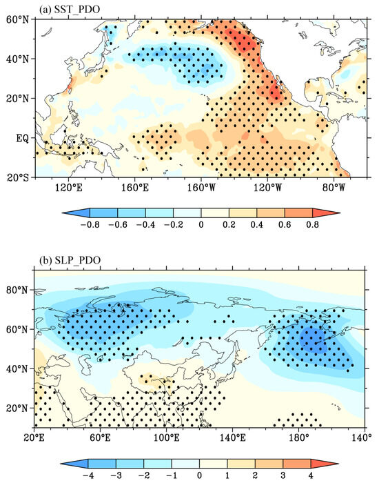 A low-pass time filtering with a period of over a decade is carried out on the normalized PDO index (thick black curve in Figure 1) to see the PDO interdecadal variability. Three positive epochs (i.e., 1958–1963, 1976–2005, and 2014–2020) and two negative epochs (i.e., 1964–1975 and 2006–2013) are observed. According to previous research [21,25,27,33], the PDO may act like a long-lived weak ENSO-like pattern in the SST field with the most pronounced anomalies over the North Pacific, which can be confirmed by Figure 4a. During the warm PDO phase, significant cold SSTAs appear over the mid-Pacific in the Northern Hemisphere, while significant warm SSTAs exist over the tropical Pacific, western coast of North America, high-latitude Pacific, and the margin sea of East Asia.