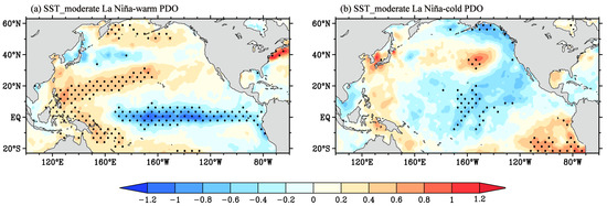 As shown in Table 1, eleven moderate La Niña episodes occur during the period from 1958 to 2020, comprising four moderate La Niña–cold PDO episodes and seven moderate La Niña–warm PDO episodes. Sub-composite analysis is therefore carried out on the wintertime SST to illustrate the basic characteristics of moderate La Niña episodes during the warm (Figure 5a) and cold phase of the PDO (Figure 5b), respectively. Substantial SSTA differences appear in the tropical Pacific Ocean between Figure 5a,b. When a moderate La Niña episode takes place in a warm PDO phase, a narrow band of significant negative SSTAs is observed in the tropical central-eastern Pacific, which is restricted to the equatorial region. Significant positive horseshoe-like shaped SSTAs also appear in the western subtropical-tropical Pacific (Figure 5a). On the contrary, the negative SSTAs related to moderate La Niña episodes in a cold PDO phase feature a relatively disorganized pattern covering the central tropical Pacific, with a comparatively weak and insignificant amplitude. In addition, compared with their counterparts in the warm PDO phase, the negative SSTAs (Figure 5b) extend farther in the meridional direction. The distinguishing moderate La Niña-related tropical Pacific forcing under different PDO backgrounds is even clearly seen from the precipitation fields (not shown), with a zonal dipole structure appearing in the tropical Pacific in a warm PDO phase, whereas no significant precipitation anomalies are noticed in a cold PDO phase. The above results imply a possibly different impact on climate anomalies of the moderate La Niña episodes between the two PDO phases.