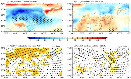 To better understand the PDO modulation effect on the impact of moderate La Niña episodes, Figure 6c,d examine the 850 hPa wind anomalies during moderate La Niña winters in warm and cold phases of the PDO. The northerly anomalies in a warm PDO phase include three branches of anomalous winds: that is, one northeasterly along the latitude of approximately 55 °N, transporting robust cold air from high latitude to the Lake Baikal region, one northeasterly related to a cyclonic circulation system over the middle-latitude North Pacific, bringing cold air from the inland area into the Northwest Pacific, and another one northerly along the eastern coast of the Asian continent, which penetrates all the way down to the subtropics and then turns easterly at the Yangtze River region. The above three branches of anomalous northerlies suggest an enhancement of the EAWM, favoring cold air from the high-latitude inland areas transported to lower latitude, leading to obvious negative SAT anomalies in East Asia and the adjacent seas (Figure 6a). Conversely, compared to Figure 6c, the anomalous winds over the EA eastern coasts in Figure 6d turn into southerlies along the western flank over an anticyclonic system centered at approximately 45° N, 170° E. As a consequence, positive SAT anomalies over East Asia are observed despite the limited significant areas (Figure 6d).