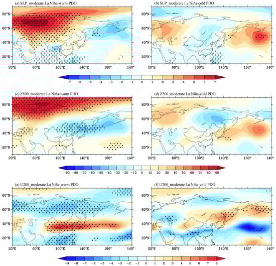 Composite (a,b) SLP, (c,d) Z500, and (e,f) U200 anomalies during moderate La Niña winters in (a,c,e) warm and (b,d,f) cold PDO phases. Anomalies significant at the 95% confidence level are dotted.