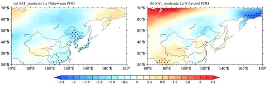 Figure 6a,b depict the SAT anomalies related to moderate La Niña episodes in the two PDO phases, respectively, where pronounced differences over East Asia between them are observed. Significant moderate La Niña-related negative SAT anomalies dominate most of the area of the East Asian continent and surrounding Northwest Pacific during warm PDO winters (Figure 6a), with a stronger magnitude and a larger significant area compared to those shown in Figure 2d, whereas in the cold PDO phase, the moderate La Niña-related SAT anomalies in East Asia are quite weak and barely pass the significance test (Figure 6b). The different SAT anomalies shown in Figure 6a,b confirm that the PDO really plays a crucial part in modulating the relationship between the EA winter SAT and moderate La Niña episodes.
