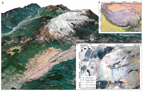 (a) Yulong Snow Mountain is located in the Southeastern Qinghai–Tibetan Plateau and the southern end of the Hengduan Mountains. (b) The location of Baishui River Glacier No. 1 on Yulong Snow Mountain. (c) Baishui River Glacier No. 1, the areas of different unmanned aerial vehicle surveys (the 2018 survey is shown as a red rectangle, and the 2021 survey is shown as a yellow rectangle), and the position where unmanned aerial vehicles were launched.