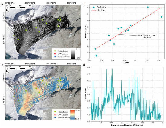 We can further demonstrate this relationship with our data in a larger area. Twelve evenly distributed homologous points were first selected, and the surface velocity and corresponding gradients were extracted. A similar correlation coefficient, 0.91, was derived, indicating, again, that this relationship can be used to derive the surface velocity of BRG1. The linear equation between them was fitted and is shown in Figure 4b, where the gradient increases by 0.1, and the velocity increases by ~1.13 m/a.