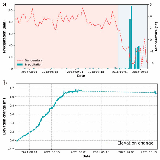 (a) The precipitation and temperature data collected between 22 July and 20 October 2018 from the meteorological station. (b) Surface elevation data between 22 July and 20 October 2021 from a real-time platform.