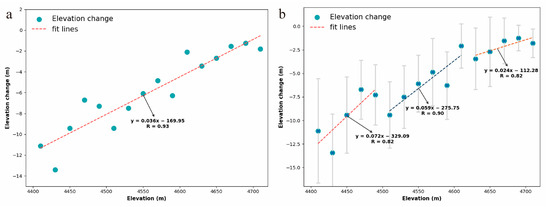We further analyzed the elevation changes in three regions separated by elevation every 100 m. The fitting rate between elevation change and elevation was derived for the three regions, as shown in Figure 6b. Moreover, high correlation coefficients, 0.82, 0.90, and 0.82, were again derived for these regions. The rates were 0.072, 0.059, and 0.024, respectively, showing that they decrease with increasing elevation. The depiction of BRG1′s mass loss rate with elevation also illustrates the weakening of snow and ice melt with elevation because of lower temperatures at higher elevations.