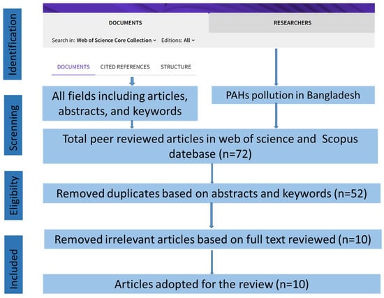 For this review, we conducted searches using various keywords in databases such as Web of Science, Google Scholar, and Scopus to gather relevant research articles [46,47]. Keywords like “PAHs pollution”, “PAHs pollution in Bangladesh”, and “PAHs pollution globally” were employed to retrieve peer-reviewed articles. Additionally, we used specific country names in combination with the term “PAHs pollution” to search for relevant publications, such as “PAHs pollution in China”, “PAHs pollution in the USA”, “PAHs pollution in India”, “PAHs pollution in Pakistan”, and “PAHs pollution in Bangladesh”. The number of publications was tallied from 2004 to 2022 in the Web of Science database using the keyword “PAHs pollution globally”. We followed the PRISMA method to select and include articles for review [46,47,48]. The selection process is outlined in Figure 1. For this review, we focused exclusively on peer-reviewed articles indexed in PubMed, Web of Science, and Scopus databases.