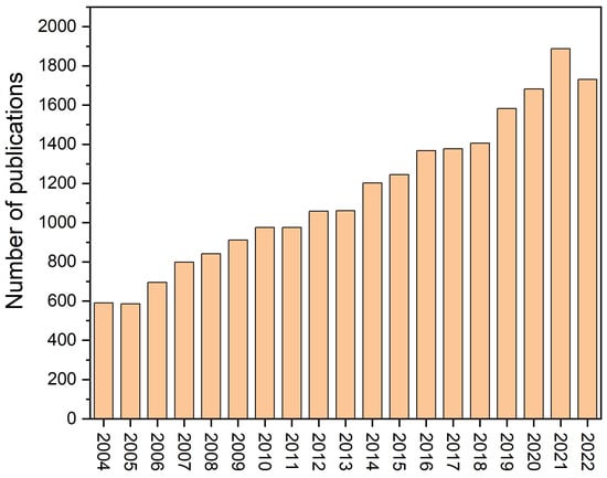 Global polycyclic aromatic hydrocarbon pollution research has attracted considerable attention in recent times [35,36,37,38,39,40]. These higher attentions to PAHs research are mostly related to changes in global socioeconomic growth, anthropogenic activities, and energy transitions [34]. According to the Web of Science database, about 26,500 research articles have been published globally that are related to PAHs pollution from 2004 to 2022 [49]. The number of PAHs research publications has been increasing, and considerably more publications were started in 2012 (Figure 2).