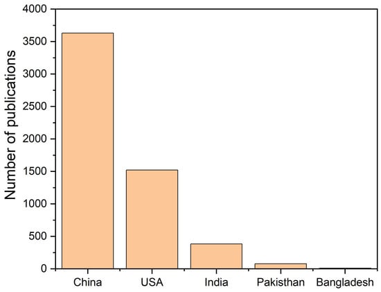 When comparing the number of research articles published by other countries, it appears that China has published the most articles related to PAH pollution (Figure 3). Therefore, surrounding countries like India and Pakistan also had a higher number of PAHs pollution-related research publications than Bangladesh (Figure 3). These results indicate that the research on PAHs pollution in Bangladesh is less well studied and has fewer research publications than in other countries.