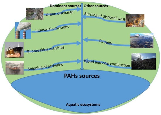 Polycyclic aromatic hydrocarbons (PAHs) are among the most widespread and persistent organic contaminants in the environment. PAHs are semi-volatile and have low water solubility in the environment [1,2]. Among the PAH compounds, 16 PAHs have been classified as hazardous pollutants by the “United States Environmental Protection Agency” [3]. Due to the extensive presence of PAHs in the environment, including in the air, surface water, soils, and biota [4,5], different countries have strict concerns about their toxic effects on ecosystems and human health [6,7]. Human exposure to PAHs can lead to various toxic effects such as carcinogenicity, endocrine-disrupting effects, genotoxicity, neurotoxicity, immunotoxicity, reproductive toxicity, etc. [8,9,10]. Adverse human health effects due to PAH exposure encompass cataracts, liver and kidney damage, pulmonary abnormalities, cancers, reduced immunity, respiratory problems, and symptoms resembling asthma [10]. Studies have shown elevated risks of lung cancer, which are sixteen times greater among charcoal furnace workers than in the general population. [11]. PAHs have also been linked tumor growth in mice, leading to cancer, and are linked to adverse effects on human pregnancy including abnormal head and weight circumference in newborns [12]. PAHs primarily sink into sediments from both natural and anthropogenic sources, subsequently leading to bioaccumulation in aquatic organisms [13]. The sources of PAHs in the environment are diverse and intricate, encompassing forest fires, volcanic eruptions, coal combustion, industrial and wastewater sewage, petroleum and oil leakage, mining, and transportation [14]. In an anoxic environment, PAHs are resistant to bacterial degradation [15,16]. However, under favorable or dissolved conditions, PAHs will be released into the aquatic environment and are bioavailable and bioaccumulated to aquatic organisms and the food web [17,18].
