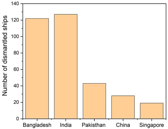The shipbreaking industry is an important sector to provide raw materials for steel industries in Bangladesh [112]. Bangladesh is one of the top destinations for recycling ships [113]. Ship recycling industries are mostly developed in the coastal areas of Bangladesh, especially in the Chittagong Division. In 2022, Bangladesh recycled 122 ships, which is the second-highest number among all the countries in the world (Figure 5).