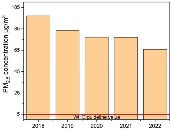 The annual average PM2.5 concentrations of air in Bangladesh (Data source) [82].