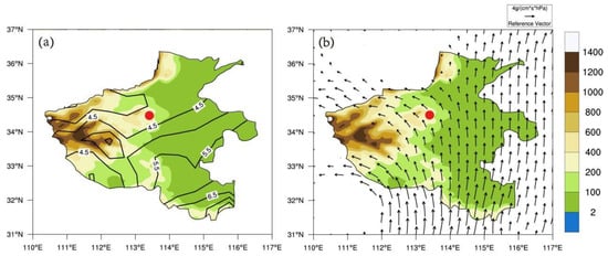 Henan’s daily average precipitation in July from 1981 to 2010 is depicted in (a) (contour lines, unit: mm/day), while (b) shows the 925 hPa water vapor transport flux (vectors, unit: g/(cm * s * hPa)) with terrain height shaded (unit: m). The red dots represent the center of Zhengzhou, and this convention applies throughout.