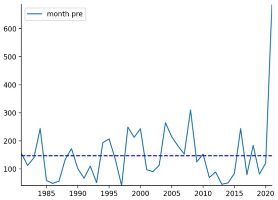 The precipitation series in Zhengzhou for July from 1981 to 2021 is shown in Figure 4 (unit: mm). The dashed line represents the average precipitation for July from 1981 to 2010.
