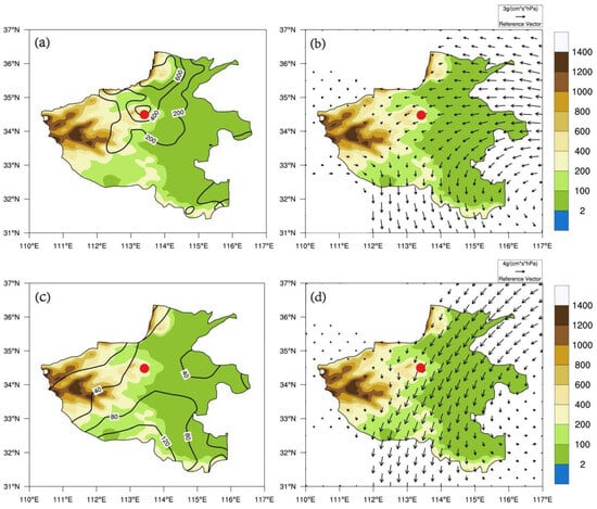 Simultaneously, it is observed that the precipitation in Zhengzhou in July 2008 was also exceptionally high, with anomalies exceeding 40 mm and anomalies in the southern part of Henan exceeding 120 mm (Figure 5c). The anomaly distribution of water vapor flux (Figure 5d) shows that Zhengzhou is located in anomalous north-to-south moisture transport. The meridional gradient of the terrain to the north of Zhengzhou is approximately −0.4 × 10−2 m/m, indicating that Zhengzhou is situated on the windward slope of the anomalous northward moisture transport. The close relationship between anomalous precipitation and this factor is evident, and the same principle applies to the formation of precipitation anomalies in the southern part of Henan.