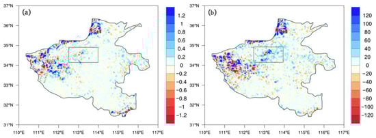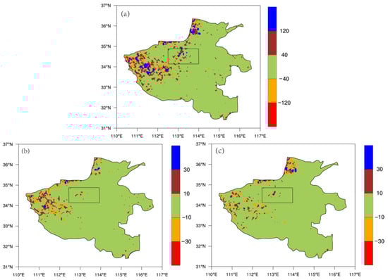 Figure 6a shows the spatial distribution of terrain-induced precipitation in July from 1981 to 2010 in Henan Province. Positive values indicate an increase in precipitation due to terrain, observed on windward slopes, while negative values indicate a decrease, observed on leeward slopes. The regions with significant terrain-induced precipitation are concentrated in the western Funiu Mountains, the northern Taihang Mountains, and a smaller area in the southern Dabie Mountains. In the relatively flat central region, the terrain-induced precipitation is between ±0.4 mm, indicating minimal impact from terrain uplift. In July, southward prevailing winds over Henan (Figure 3b) resulted in significant terrain-induced precipitation exceeding 0.4 mm on the southern slopes of the Funiu Mountains, corresponding to the precipitation center (Figure 3a).