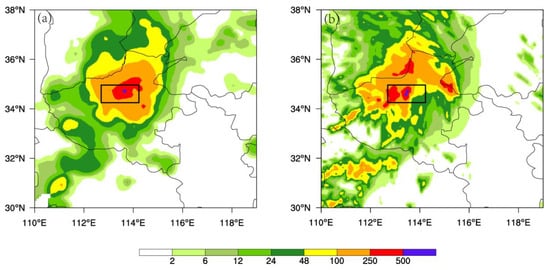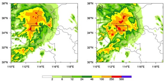 Distribution of 24 h accumulated precipitation simulated by sensitivity experiments (unit: mm) from 00:00 on 20 July 2021 to 00:00 on 21 July 2021. ((a) EXP1, (b) EXP2). The area enclosed by the black box is Zhengzhou.
