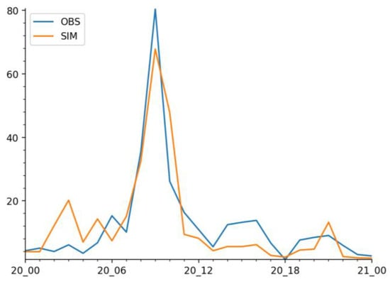 Figure 8 shows the regional average hourly precipitation series for Zhengzhou on 20 July 2021, comparing the actual observations with the model simulations. Analysis reveals that the model roughly captures the diurnal variation of precipitation on that day, with a correlation coefficient of 0.763. The simulated daily precipitation is 298.5 mm, which is close to the observed 307.5 mm. The short-term extreme precipitation simulated by the model from 08:00 to 09:00 on the 20th is 67.8 mm; although it slightly differs from the observed 80.5 mm, it still demonstrates extremity, being the maximum precipitation moment of the day and significantly higher than other times. Moreover, the model’s result of 175.6 mm during the observed extreme precipitation of 201.9 mm at the Zhengzhou station from 08:00 to 09:00 on the 20th is also quite satisfactory.