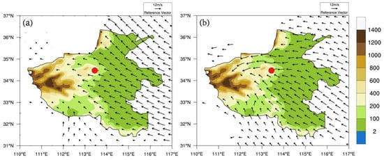 Figure 9 shows the circulation distribution of ERA5 data and WRF at 09:00 on 20 July 2021. From Figure 9a, it can be observed that at this moment, the Zhengzhou region experiences an easterly wind with a speed of 12 m/s. Comparing with Figure 9b, the Zhengzhou region exhibits a similar easterly wind pattern with a speed of around 12 m/s. In the northeast part of Henan Province, there is a disparity between the simulation and the actual conditions, where the actual wind is from the southeast, while the simulated result indicates an easterly wind with relatively lower intensity. Considering that the circulation field in the northeast is not within the scope of this study and has a minor impact on this extreme rainfall event, it is considered that the model reasonably simulated the circulation pattern of this extreme rainfall event.