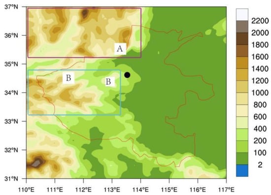 EXP1 (purple frame) and EXP2 (blue frame) mountain area. The area enclosed by the red solid line is Henan Province, the black dot is the rainfall center (34.7° N, 113.7° E), A and B are Taihang Mountain and Funiu Mountain.