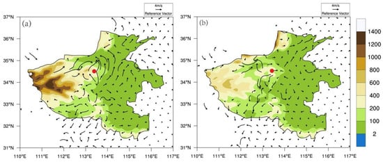 The 925 hPa wind field difference (arrow, unit: m/s) between the sensitivity test ((a) EXP1, (b) EXP2) and the control test in Henan Province on July 20, 2021, terrain height (shadow, unit: m). The red dots represent the center of Zhengzhou.