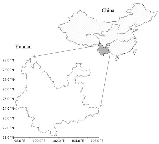 Yunnan (97°31′ E–106°11′ E, 21°8′ N–29°15′ N) is located in a low-latitude inland region of China’s southwestern border (Figure 1), with a meridional span of 864.9 km and a zonal span of 990 km, covering a total area of 394,100 km2. The elevation is higher in the northwest and lower in the southeast, showing a step-like decline pattern from the north to the south. Thus, Yunnan displays typical mountainous plateau terrain, where 88.64% of the total area is mountainous. Six major river systems flow through this province, i.e., the Yangtze, Pearl, Yuanjiang, Lancangjiang, Nujiang and Dayingjiang Rivers. Most of Yunnan is located in mid-altitude areas, with the area at 1000–3500 m altitudes accounting for 87.21% of the total area. In total, 56.46% of the province’s area has a slope gradient of less than 25°. In terms of landform types, plains, plateaus, hills and mountains account for 4.85%, 1.55%, 4.96% and 88.64% of the total area, respectively. Low air temperatures in winter and steep slopes in mountainous areas often cause wire and tower icing, posing a risk to power transmission.