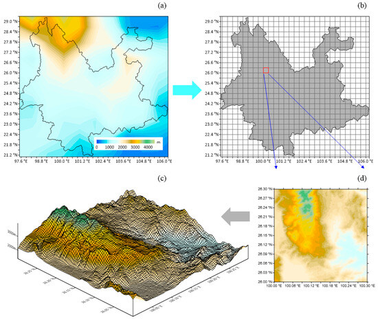 Data reconstruction: The DEM is partitioned into X × Y subregions (X and Y represent the grid numbers), each of which has the same shape and size (Figure 2b).