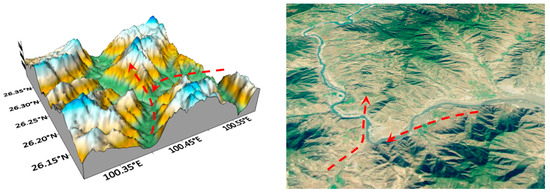Valleys are the representative feature of the “Valley-Air Channel” pattern. As the distributions of valleys and gullies are widespread in Yunnan, this terrain pattern is the most common one. For instance, the north side of the mountains peaks more than 2500 m in Jinsha River bend (Figure 5), near Xiagan Village, Yongsheng County, Lijiang City, where the southerly wind passing through the river valley near Shangliu Village converges with the easterly wind from Jinsha River. The converging airflow is uplifted by the terrain forcing. Since this area is located in low latitudes, warm wind blows all year round, and the climate is dry. Many high-voltage lines pass through areas of this terrain pattern, such as the No. 36 pole of the 110 KV Liuping line in Nanpanjiang Valley, the No. 282–283 poles of the 220 KV Yikun line in Daheishan Valley wind trough, and the No. 76–77 poles (in the valley wind channel of Tujie Town) of the 500 KV Mankun line in Ailao Mountain. Note that water bodies can bring more water vapor in this terrain pattern. Affected by the terrain uplifting effect, icing may become more intense. Therefore, this terrain pattern may result in an increase in water vapor, as in the case of the Ailao Mountain section of the 500 KV Dakun line, which is influenced by the reservoir of the Laohu Mountain power station.