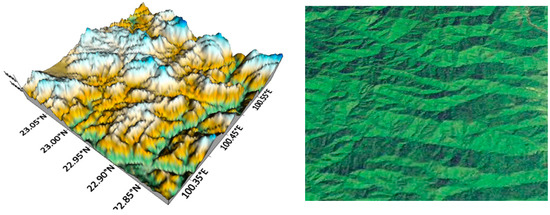 The “Ravine” pattern is primarily defined by its irregular and undulating underlying surface, featuring numerous ravines and gullies. The relief of the terrain varies from several kilometers to tens of kilometers, creating an uneven underlying surface that is also conducive to limited small-range precipitation. This pattern’s unique characteristics play a significant role in defining local hydrological conditions and influencing the distribution of precipitation within the region. For example, the satellite image of Dakonghai Village, Jinggu Dai and Yi Autonomous County, Pu’er City (Figure 7), shows irregular gullies. The maximum and minimum elevations in this village are 2920 m and 813 m, respectively, and the annual mean rainfall is 1354 mm.