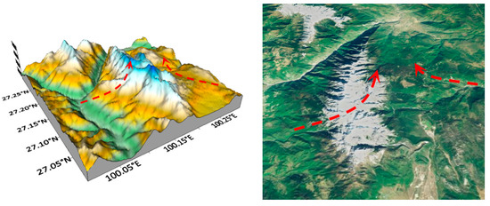The “Alpine Divide” pattern (Figure 9) is often distributed at higher elevations, which can block airflows on both sides to form an obvious precipitation boundary. The Jade Dragon Snow Mountain in Lijiang City, where the elevation is 4000–5000 m and snow covers the area all year round, is located in the alternating control zone of the westerly circulation, southwest monsoon and southeast monsoon. In the rainy season, this region is controlled by the southwest monsoon and southeast monsoon. The annual precipitation is 935 mm in the Jade Dragon Snow Mountain. As shown in the satellite image, the western side of the mountain ridge is covered by snow, but the eastern side is not. Therefore, this area belongs to the typical terrain of the “Alpine Divide” pattern. In addition, the divide between the Jinsha River and the Xiaojiang River also falls into this terrain pattern.