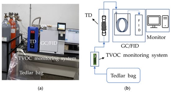 (a) Experimental setup and (b) schematic view of TVOC monitoring system with TD-GC system.