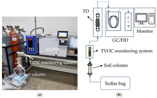 The combination of the TVOC monitoring system and TD-GC system (as noted in Section 2.3) was employed, incorporating a soil column between the TVOC monitoring system and the tedlar bag (Figure 4). A cylindrical acrylic column with a diameter of 50 mm and a height of 200 mm was used for the soil column experiment. A 1 mm-thick VOC permeable membrane was placed at the bottom of the column to fill the column with soil, allowing the passage of VOC gases through the column. For the type of soil used in the experiment, standard sand (Jumunjin sand, Gangneung, Republic of Korea) of 1.18~1.4 mm in size was used. Prior to the test, the sand was dried at 110 °C for 24 h in a drying oven. Following the complete filling of the soil column using dried sand, the inlet of the soil column was connected to a tedlar bag containing TVOC concentrations of 50, 500, or 5000 ppbv. Concurrently, the outlet of the soil column was connected to the input of the TVOC monitoring system. The condition for adsorption in the TD-GC was set at a flow rate of 150 mL/min with an adsorption duration of 20 min. Regarding the flow rate of the pump, the TD was maintained at a consistent flow rate of 150 mL/min during the soil column experiment, and the adsorption occurred every 43 min as scheduled in the TD-GC system.