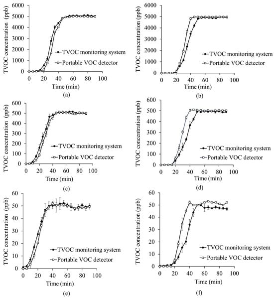 Further verification of the TVOC monitoring system was carried out with respect to its responsiveness to changes in concentration. When the VOC concentrations of 50, 500, and 5000 ppbv were simultaneously analyzed within a 50 cm × 50 cm × 50 cm acrylic chamber using both the TVOC monitoring system and a portable VOC detector, as shown in Figure 3, the TVOC monitoring system exhibited a comparatively slower convergence to the concentration levels. For example, the portable VOC detector achieved a concentration of 5000 ppbv within 40 min upon the injection of 5000 ppbv into the chamber, whereas the TVOC monitoring system required 50 min to reach the same level. The TVOC monitoring system experienced a comparable delay in arrival, irrespective of the concentration level of VOC within the tested range (Figure 6). The underlying reason for this phenomenon is postulated to stem from the variance in assessing VOC using sensor detection via diffusion versus advection. This was substantiated by noting that when directing the flow rate to the TVOC system sensor using a pump, its responsiveness closely matched that of the portable VOC detector.