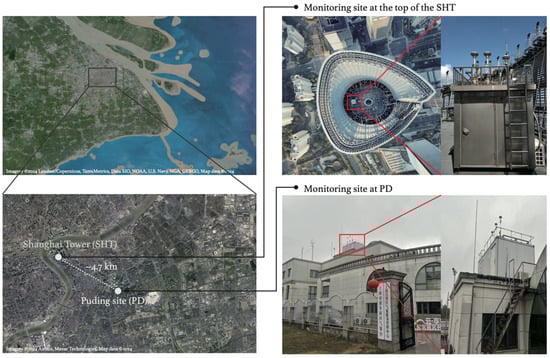The geographic location, landscape, and deployment of the monitoring sites at Shanghai Tower (SHT, high-altitude) and Pudong (PD, surface), respectively.