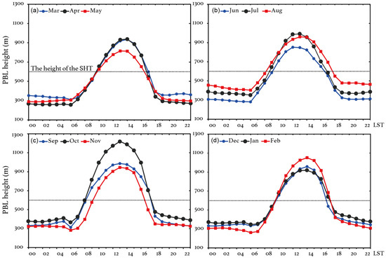Diurnal variations in the reanalysis PBL height (unit: m) at the grid box where the Shanghai Tower site (SHT) is. The black dash lines represent the altitude (~600 m) of SHT. The results for (a) spring (March to May), (b) summer (June to August), (c) autumn (September to November), and (d) winter (December to February) are shown. Numbers in the x-axis are local standard time (LST).
