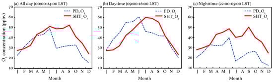 The observed monthly mean O3 concentrations (unit: ppbv) at SHT and PD during 2017–2018. The results for (a) all-day (00:00–24:00 LST), (b) daytime (09:00–16:00 LST), and (c) nighttime (22:00–05:00 LST) averages are presented.