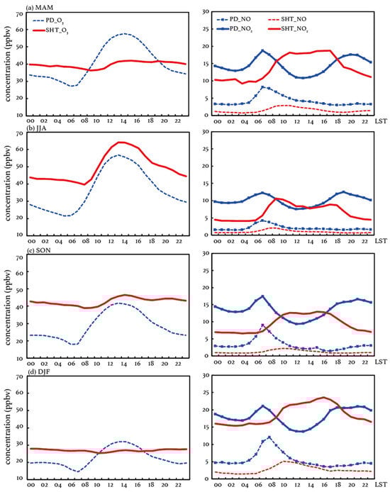 The seasonal mean diurnal variations in concentrations (unit: ppbv) of O3, NO, and NO2 at SHT and PD in (a) spring (MAM), (b) summer (JJA), (c) autumn (SON), and (d) winter (DJF) during 2017–2018.
