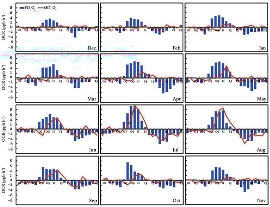To further investigate the causes of ODs in various seasons, we analyze the diurnal variation in the O3 changing rate (OCR = d[O3]/dt) at SHT and PD in Figure 5. The OCR can be determined by the changes in air pollutant concentrations due to transport, chemical production, chemical loss, and emissions. Since O3 is a secondary pollutant which is not directly emitted into the atmosphere, d[O3] induced by emission changes can be zero. The effect of advection can also be mitigated by the application of a monthly average for the diurnal trend analysis. The observed OCR at PD exhibits similar diurnal patterns as those reported in previous works [58]. Generally, a positive OCR is evident from 06:00 to 14:00 LST during summertime and 08:00 to 13:00 LST during wintertime, suggesting the accumulation of O3 near the surface. Between 08:00 and 10:00 LST, the OCR reaches relatively high values due to enhanced O3 production promoted by increasing precursor emissions and sunlight. Negative OCRs are observed after 15:00 LST, and these extend to the morning. This period is characterized by weakened photochemistry as the sun goes down, leading to an increase in the titration and consumption of O3. Consequently, there is a prevalence of O3 depressions compared to production near the surface. The most rapid O3 decrease, ranging from −3.0 to −6.0 ppbv h−1, at PD occurs during 17:00–19:00 LST, which is associated with a resurgence in NOx emissions during evening rush hours.
