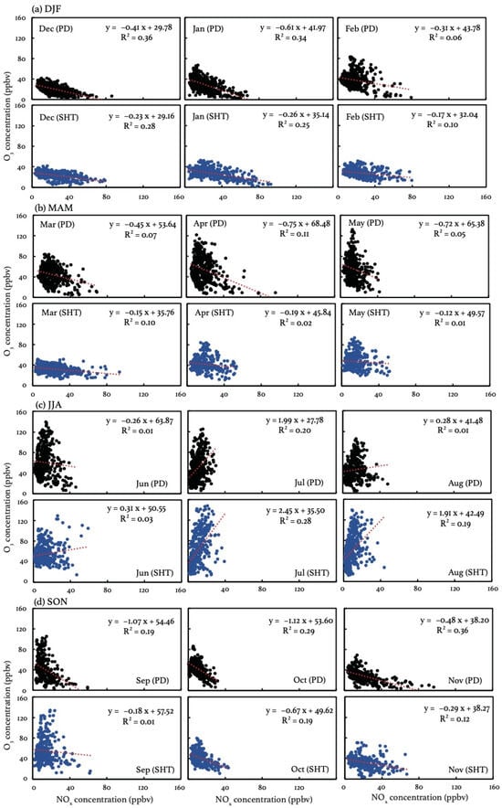 The scatter plots of monthly mean O3 (y axis) and NOx (x axis) concentrations during the daytime (09:00–16:00 LST) in (a) DJF, (b) MAM, (c) JJA, and (d) SON during 2017–2018.