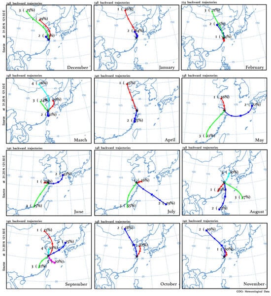 The 48 h backward trajectory cluster results during each month in 2017 and 2018 using the Hybrid Single-Particle Lagrangian Integrated Trajectory (HYSPLIT) model driven by the reanalysis data (2° × 2.5°) provided by the National Centers for Environmental Prediction (NCEP) and the National Center for Atmospheric Research (NCAR). The starting location is where SHT locates (31.2° N, 121.5° E, 600 m) the percentage of each group in the total number of flows are marked in each figure.