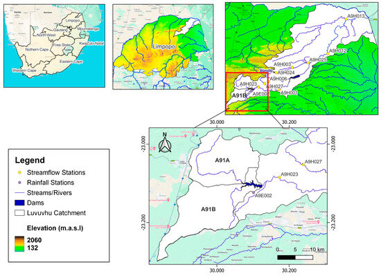 - Dagada, K. Influence of Climate Change on Flood and Drought Cycles and Implications on Rainy Season Characteristics in Luvuvhu River Catchment, South Africa. Master’s Thesis, University of Venda, Thohoyandou, South Africa, 2016. [Google Scholar]