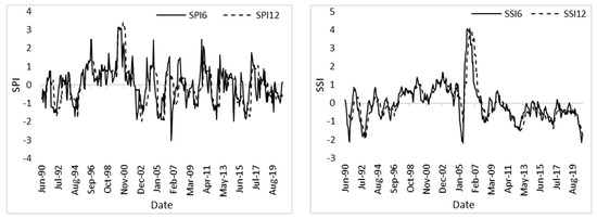 Meteorological (SPI) and hydrological (SSI) drought time at 6- and 12-month timescales for stations A9E002 and A9H023, respectively.
