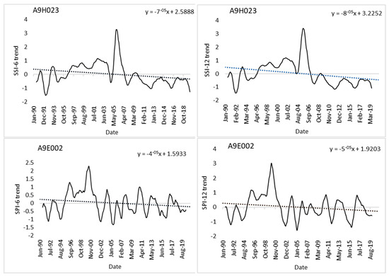 SPI and SSI BFAST trend at 6- and 12-month timescales for stations A9H023 and A9E002.