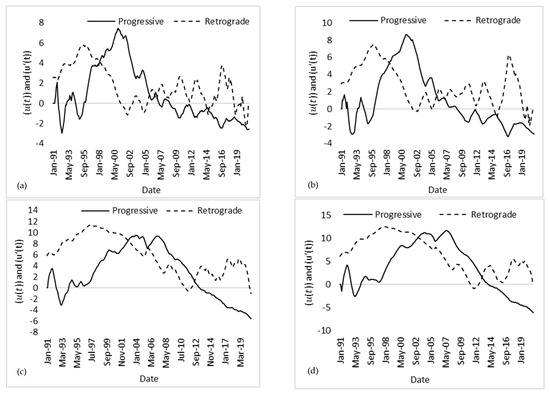 Equation (15) gives a forward sequential progressive statistic. To calculate the backward/retrograde statistic values (), the same time series () is used; however, the tail end of the time series is the starting point in this calculation. By combining the forward and backward sequential statistics, it makes it possible for the recognition of the estimated start of a developing trend [42]. When plotted, if and cross each other and diverge beyond the ±1.96 (95% confidence interval) threshold, a statistically significant trend exits in a time series. The region where they cross each other is the time where the trend turning point begins.