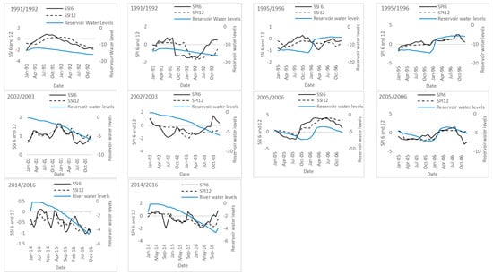 Figure 5 shows a comparison between reservoir water levels and SPI and SSI at 6- and 12-month timescales for major drought events reported over the study area (i.e., 1991/1992, 1995/1995, 2003/2004, 2005/2006, and 2014/2016). For all the drought periods, reservoir water levels decreased as SSI and SPI decreased at both timescales. For the 1995/1996 and 2005/2006 droughts, an increase in reservoir water levels was noted at the end of 1995 and 2005.