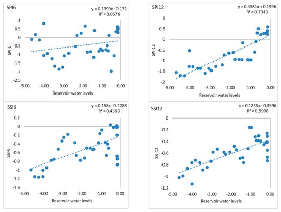 Scatterplot showing SPI and SSI correlation against reservoir water levels.
