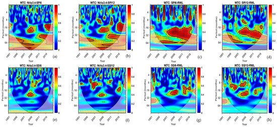 Wavelet coherence between (a) Niño 3.4 and SPI12, (b) Niño 3.4 and SPI12, (c) SPI6 and RWLs, (d) SPI12 and RWLs, (e) Niño 3.4 and SSI6, (f) Niño 3.4 and SSI12, (g) SSI6 and RWLs, and (h) SSI12 and RWLs. The phase relationship is represented by arrows (in-phase ⇾; anti-phase ⇽). The black solid line is the cone of influence and indicates a 95% confidence level; contours delimit the region where there is a strong correlation.